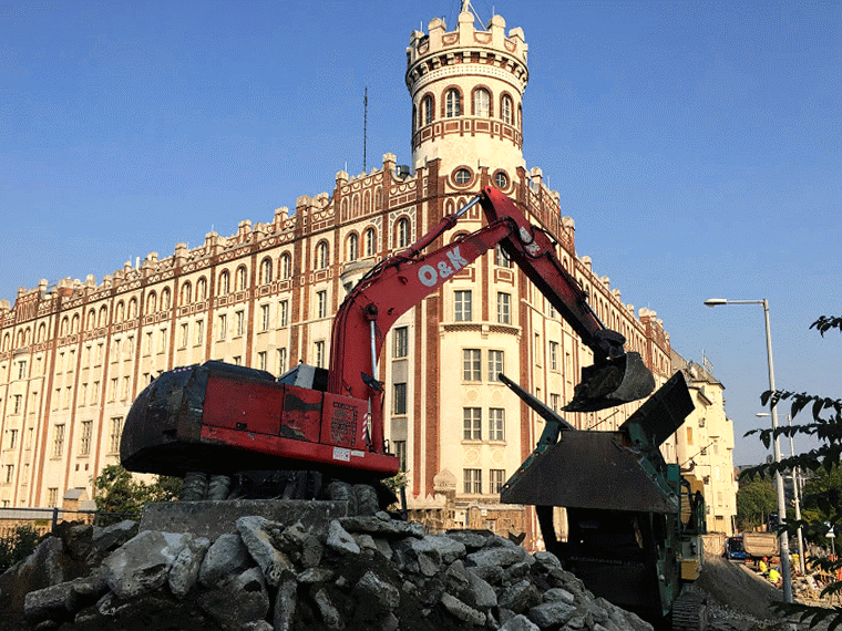 Az egykori Postapalota előtt a frissen lezárt utca anyagát pakolta a korábban már jól ismert betondarálóba egy markoló.